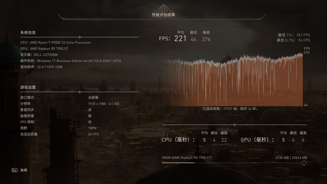 在另一款《刺客信条:幻景》游戏中,锐龙 9 9900X 的游戏平均帧数达到了 221 帧,1% Low 帧为 151 帧,刺客信条能上 200 帧的平均帧算是比较难的。