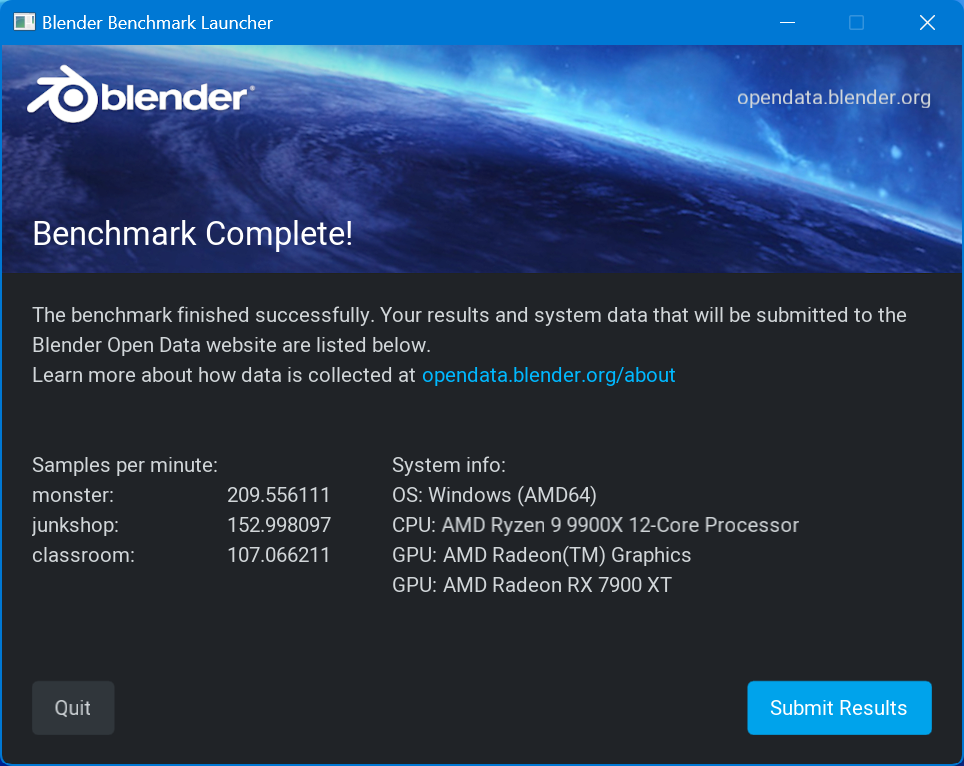 而在另一款专业渲染工具 Blender 的 BenchMark 基准测试中,选择 4.2.0 版本的测试文件,锐龙 9 9900X 的 monster 场景得分 209 分、junkshop 场景得分 152 分、classroom 场景得分 107 分。