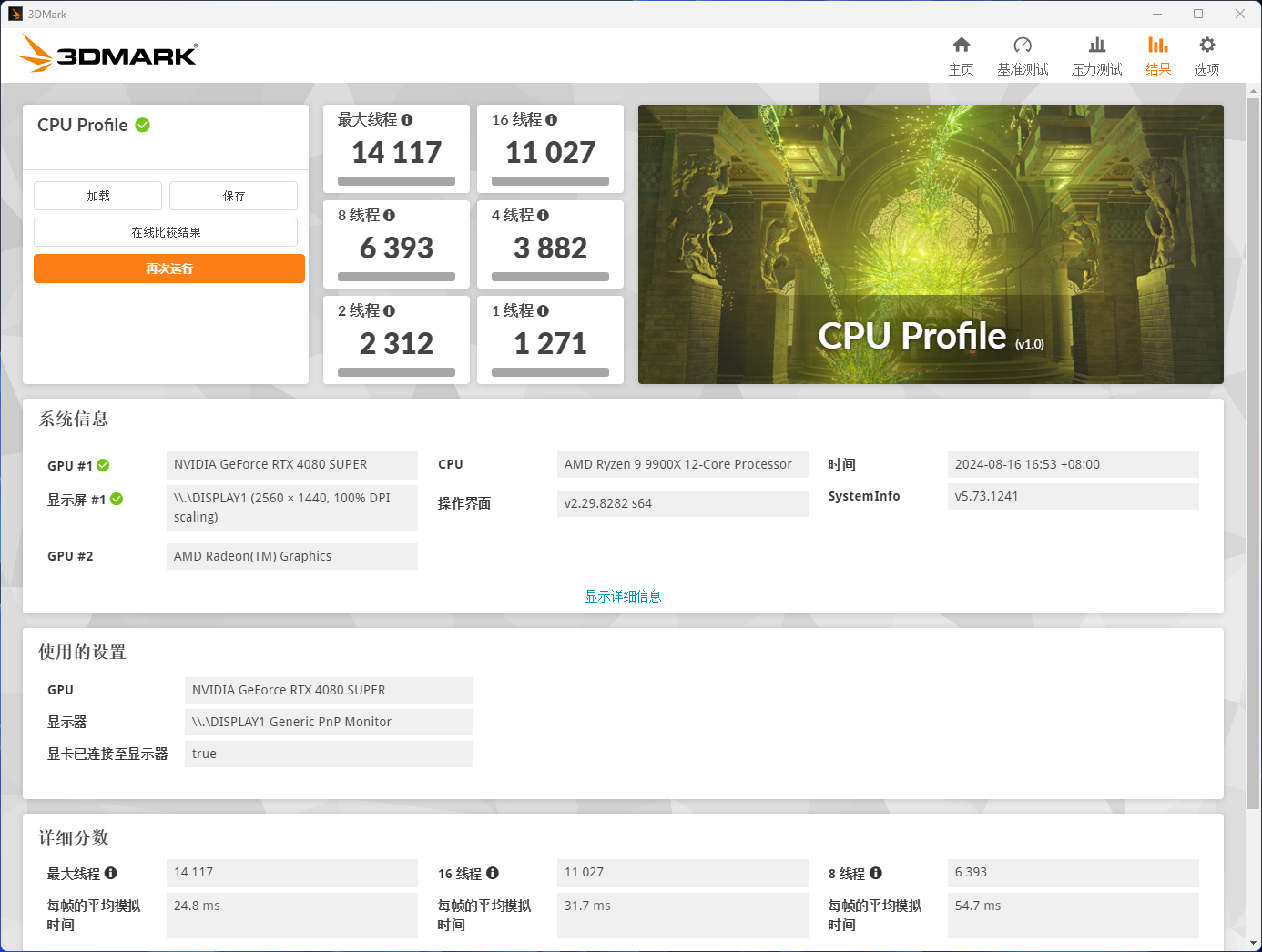在 3D Mark CPU Profile 的测试中,锐龙 9 9900X 的单线程分数为 1271 分,最大线程分数为 14117 分。几项测试下来,锐龙 9 9900X 在技嘉 B650E 电竞雕 USB4 主板的发挥都非常稳定,温度控制表现也出乎意料,看得出这块主板的供电和散热用料很扎实。