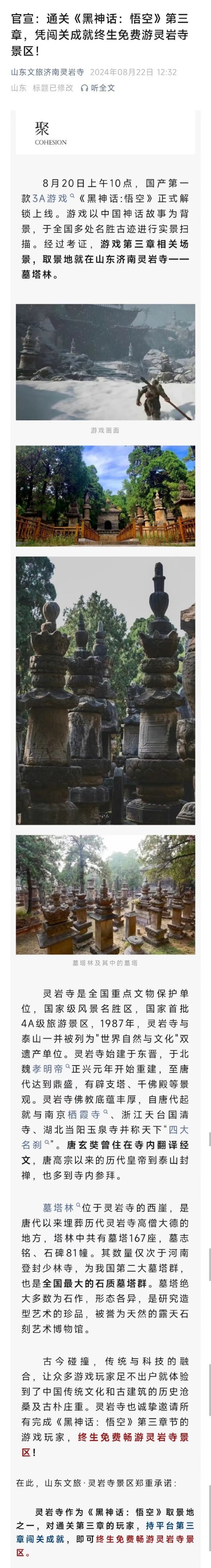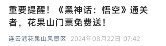 文章来源于互联网:凤凰网-花果山景区官方:通关《黑神话:悟空》者,门票免费送