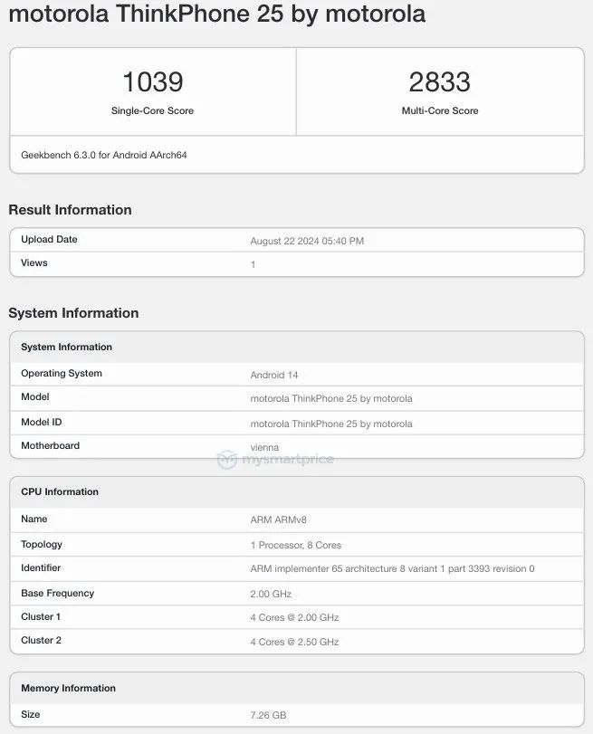 摩托罗拉 ThinkPhone 25 手机在 GeekBench 6.3.0 版本中,单核成绩为 1039 分、多核成绩为 2833 分。