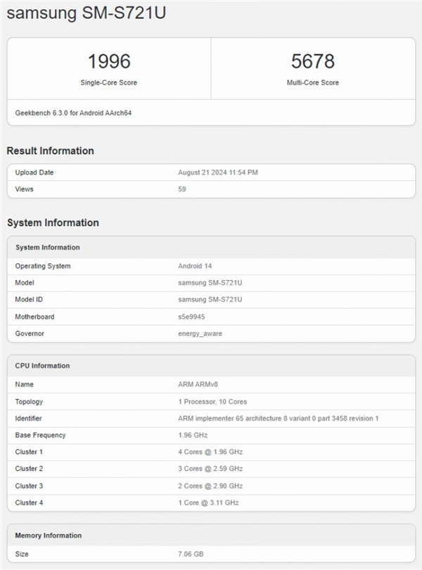 IT之家 8 月 23 日消息,一款三星 SM-S721U 新机 8 月 21 日现身 Geekbench 跑分网站,搭载了降频版 Exynos 2400 处理器。