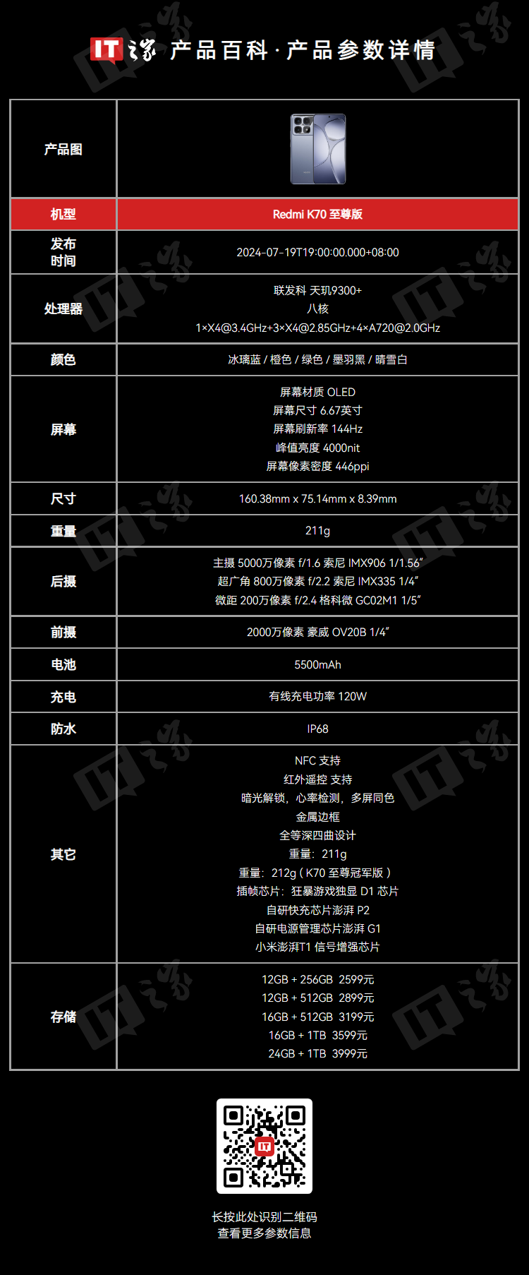 作为比较,小米在今年 7 月 19 日推出了 Redmi K70 至尊版手机,该机采用全新“无界美学”设计,使用一款 1.5K(2712×1220 分辨率)直屏,搭载联发科天玑 9300 + 旗舰处理器,采用 3D 冰封散热技术,配备 50MP“超级动态主摄”加持的三摄系统,采用 5500mAh 电池,支持 120W 快充。