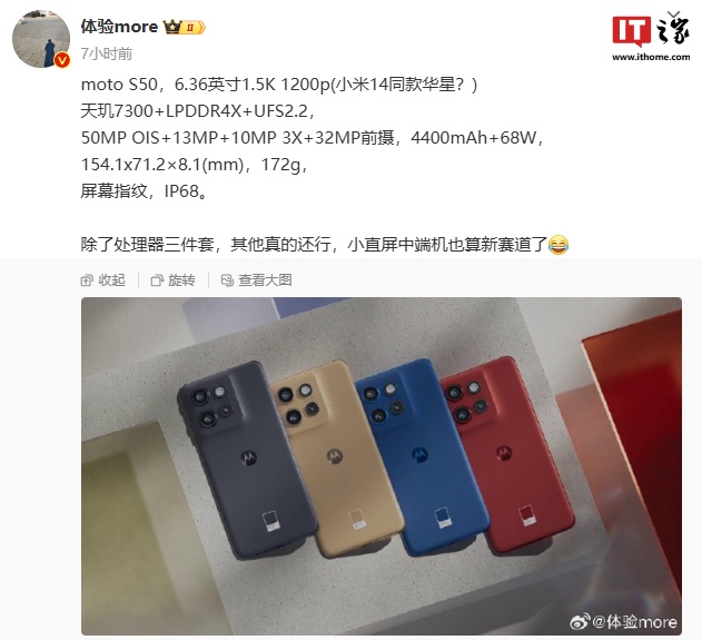 IT之家 8 月 24 日消息,联想摩托罗拉 moto S50 手机已官宣即将上市,今日博主 @体验more 曝光了这款新机的主要参数。