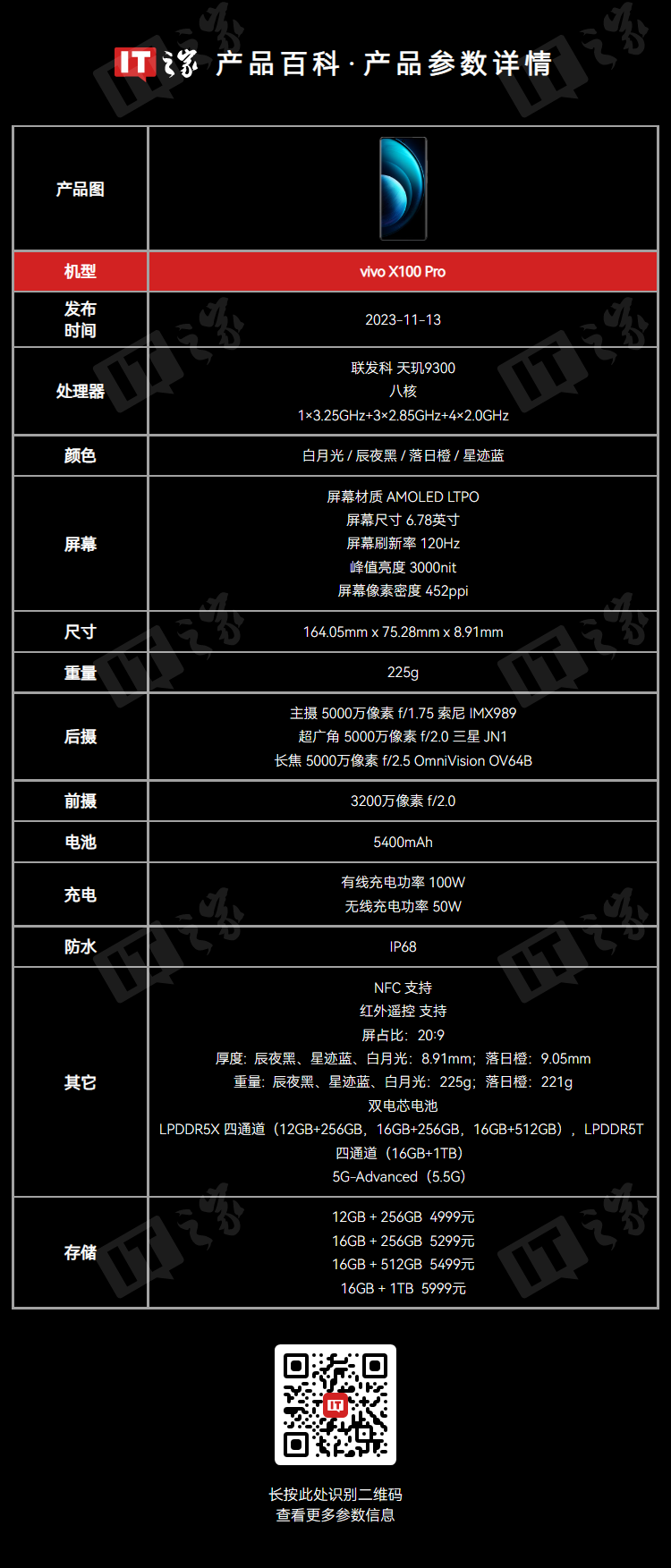 vivo X100 Pro 手机发布于去年 11 月,首发天玑 9300 处理器,搭载等效 5400mAh 蓝海电池,支持 100W 有线快充,50W 无线充,配备 6.78 英寸 2800×1260 分辨率 8T 护眼微曲屏,峰值亮度 3000nit。