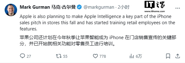 IT之家注意到,在后续推文中古尔曼还表示,苹果已经开始对零售店员工进行 Apple Intelligence 的培训,并预计将其将作为 iPhone 16 在苹果零售店销售宣传的重点。