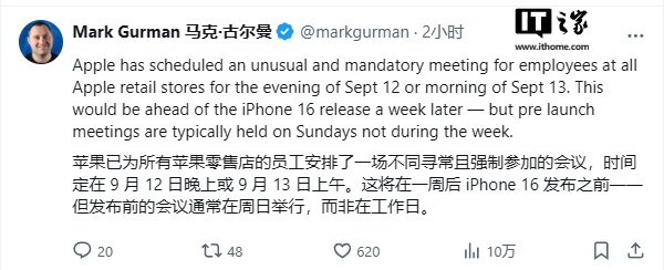 IT之家 8 月 25 日消息,据彭博社记者马克・古尔曼透露,苹果已安排所有苹果零售店员工在 iPhone 16 发布会(预计于 9 月 10 日举行)后不久参加一场强制性会议。这些会议将在 9 月 12 日晚上或 9 月 13 日早上举行,具体时间取决于商店。