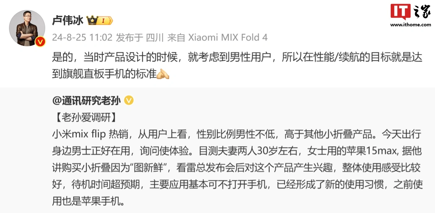 IT之家 8 月 25 日消息,小米集团合伙人、总裁卢伟冰今天表示,在对小米 MIX Flip 产品设计的时候,就考虑到男性用户,所以在性能 / 续航的目标就是达到旗舰直板手机的标准。