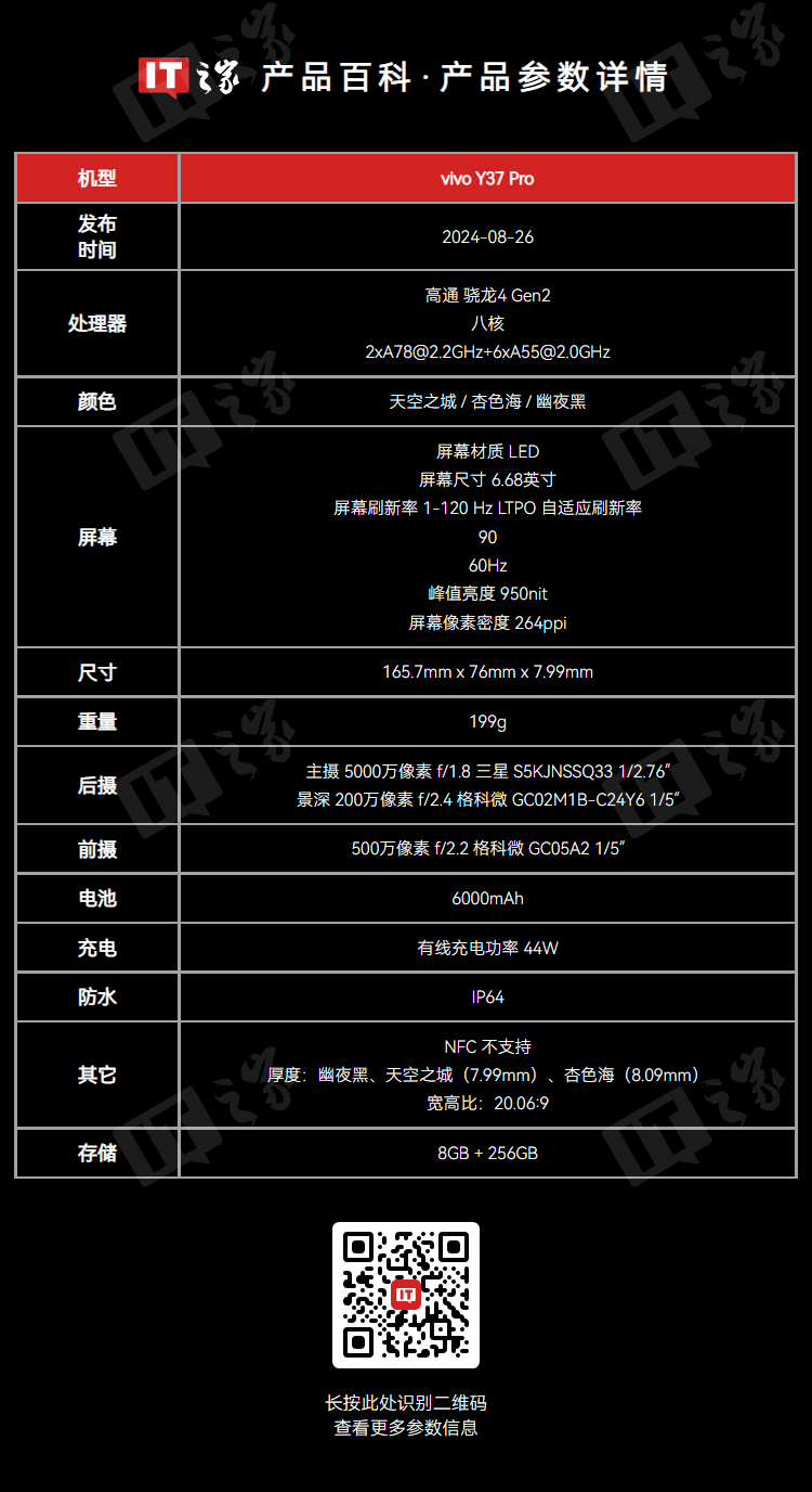 正如前文所说,vivo Y37 Pro 搭载了高通骁龙 4 Gen 2 移动平台,该平台采用 4nm 工艺,Kryo CPU 架构包含 2 个主频 2.2GHz 的 A78 核心和 4 个主频 2.0GHz 的 A55 核心,Adreno 613 GPU,主频为 955 MHz。IT之家拿到的这款 vivo Y37 Pro 搭载 8GB LPDDR4X 内存,以及 256GB UFS2.2 存储。具体参数可见下表: