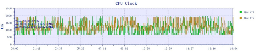 通过 CPU 的核心频率图可以看到,在进行游戏时,骁龙 4 Gen 2 的不同核心性能释放还是比较平衡的,基本上 A78 核心和 A55 核心的频率都在 0.7GHz-2.0GH 之间波动,性能资源的调度策略很合理。