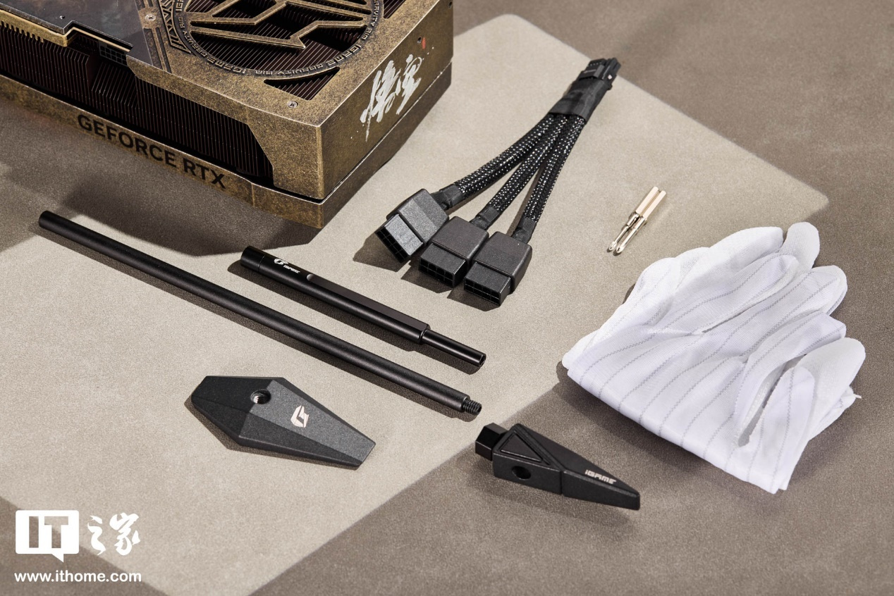 除显卡本体外,包装内还附有众多配件,包含 16pin 转 3*8pin 供电转接线,组装式金属显卡支架,铝合金材质螺丝刀(配有 2 种不同规格的螺丝头)以及一幅白手套,让用户的装机体验更有仪式感。