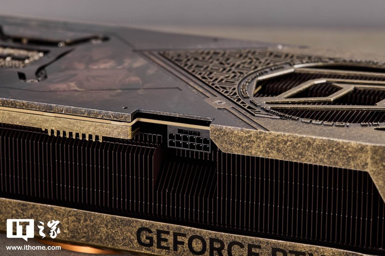 显卡旁侧可以看到内部面积超大、厚实的散热模组。整个显卡采用了宝扇散热装置,包含三把聚风扇叶风扇,7 根 8mm+2 根 6mm 热管以及大面积金属导热鳍片,辅以真空冰片技术、回流焊工艺加持,让散热表现更加出色。供电接口为 12+4pin 设计,单根线缆即可满足供电。