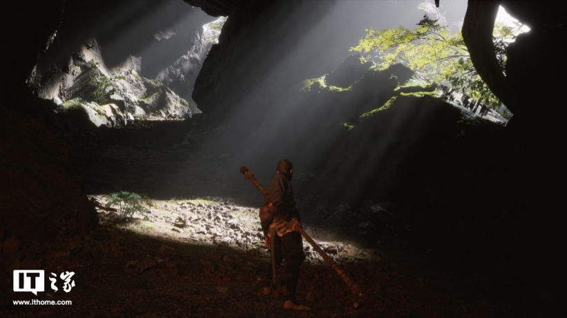 比如上图中我们截取了一张中画质黑风山关卡的某个山洞,阳光透过山洞的缺口照射下来,形成强烈的明暗反差以及轮廓清晰的光束,同时天命人背后山洞中的烛火,也照亮了原本处于暗面的身躯,天光照射区域的下方地面和天命人背后,都呈现出柔和、昏暗的烛光效果。