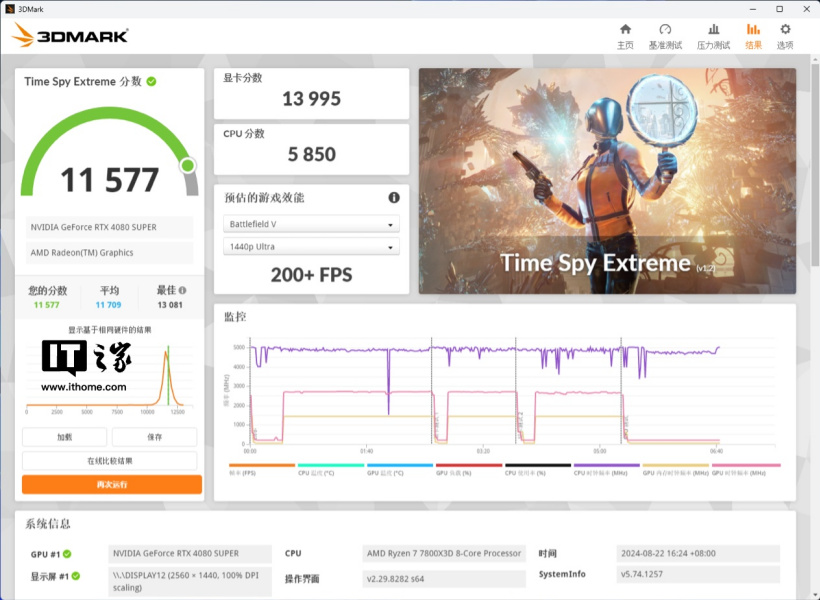 首先是 3D Mark 系列测试,在针对 DX12 4K 游戏理论性能的 Time Spy Extreme 测试中,默频下,iGame RTX 4080 SUPER Advanced 黑神话悟空定制显卡的显卡分为 13995 分,超频后,显卡分数提升至 14184 分。