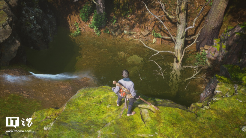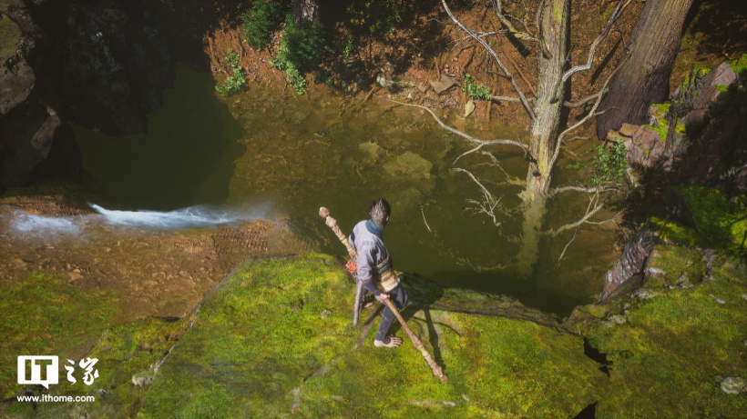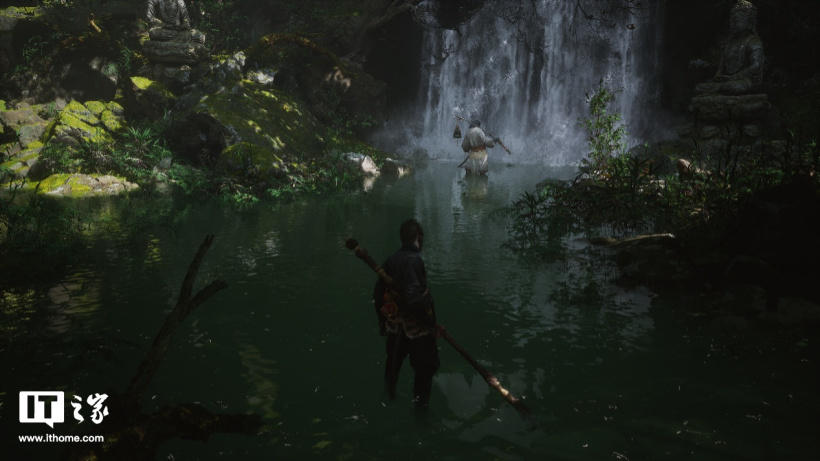 第二个特性是全分辨率光线追踪反射特性,这个特性最大的应用场景来自水面,真实的光线反射能够营造出真实的倒影效果。比如游戏中“大头娃娃”所在山谷某处瀑布前的水潭里,有个精英怪就站在此处。对比关闭 / 开启全景光线追踪的效果,关闭光追时水面的瀑布和妖怪比较黯淡和模糊,开启光追后倒影的轮廓更加明显,尤其是精英怪在水中的身形非常清晰,倒影整体也更加明亮。