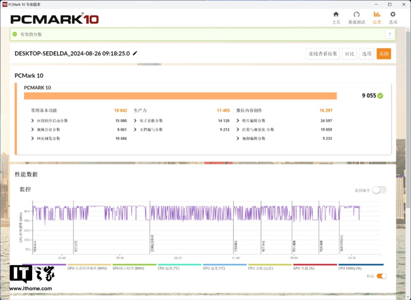 生产力方面,首先我们测试了 PC Mark 10 现代办公基准测试的表现,iGame RTX 4080 SUPER Advanced 黑神话悟空定制显卡的综合成绩为 9055 分,三个子项分都超过 1 万分,且与显卡关联度最高的数位内容创作分数达到了 16297 分,应对日常办公绰绰有余。
