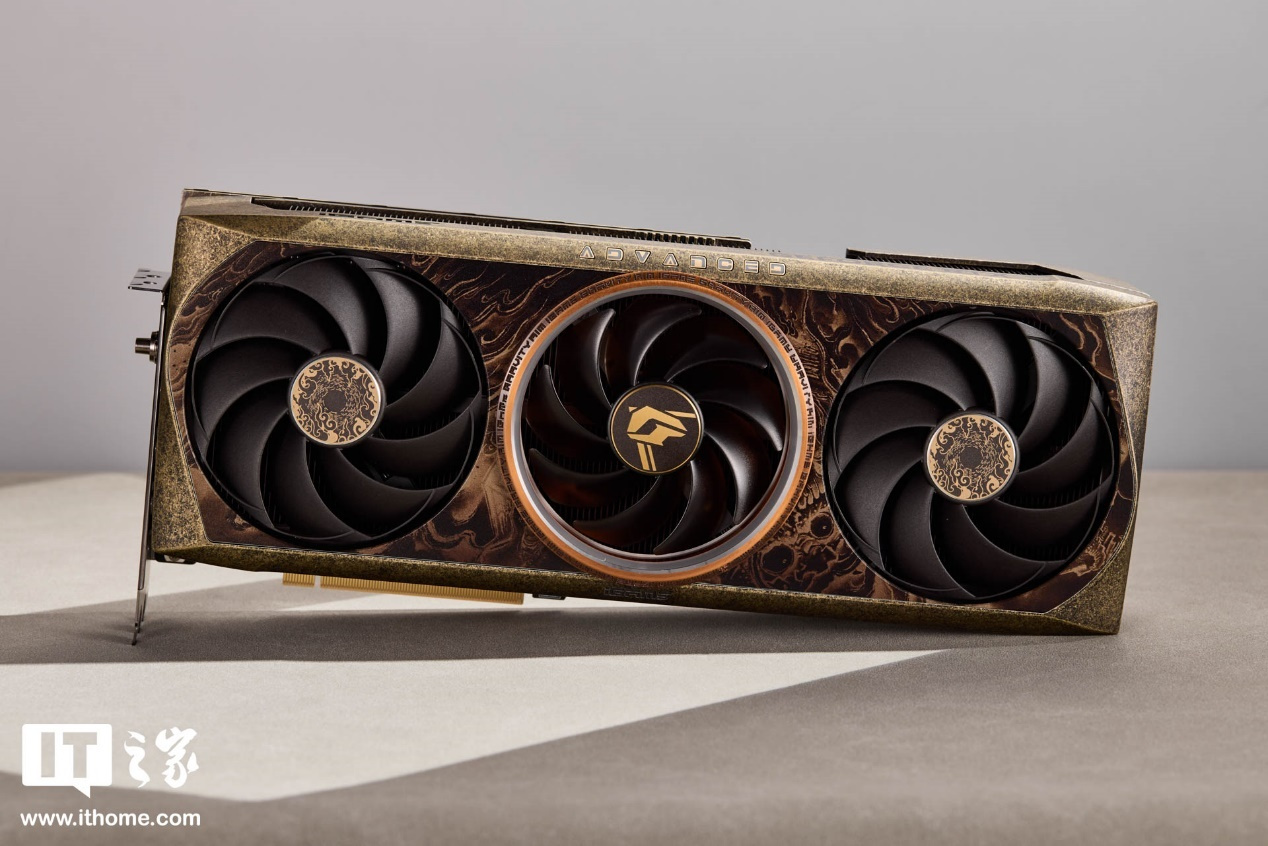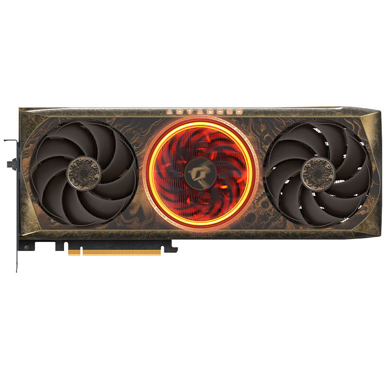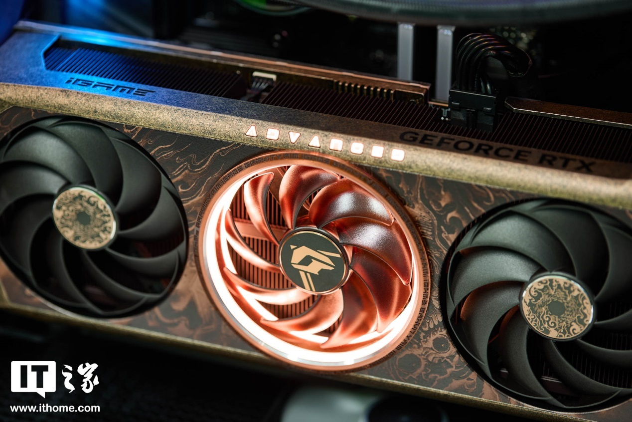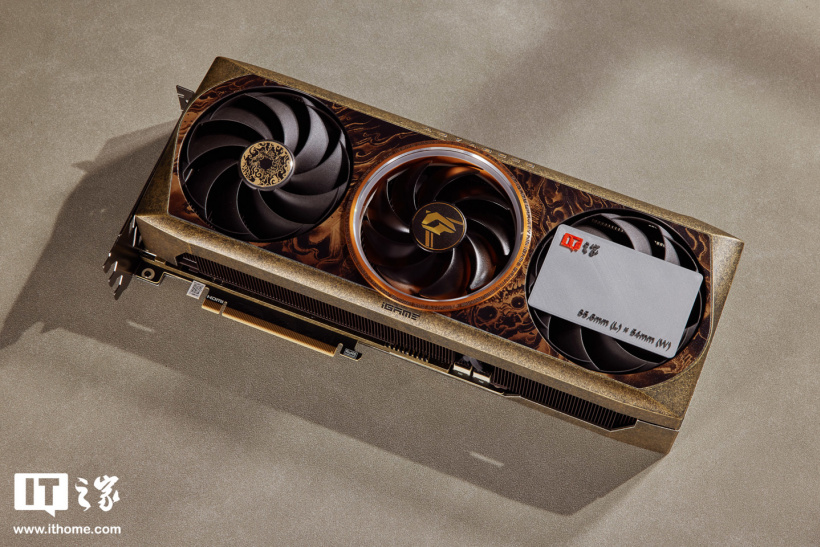 iGame RTX 4080 SUPER Advanced 黑神话悟空定制显卡是一张标准的三风扇显卡,厚度大概是 3.3 槽。整体采用复古定制涂装 + 个性灯环设计,辅以三把黑色扇叶风扇,外观辨识度极高。