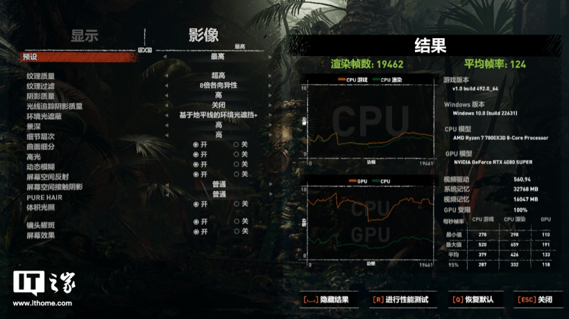 在经典 3A 冒险游戏《古墓丽影:暗影》中,选择 4K + 最高画质,运行游戏自带基准测试,平均帧数为 124 帧,1% Low 帧为 79 帧。