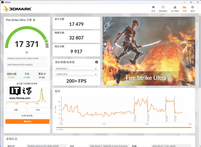 在针对 DX11 4K 游戏的 Fire Strike Ultra 测试中,默频模式下先看分数为 17260 分,超频后显卡分数来到了 17479 分。