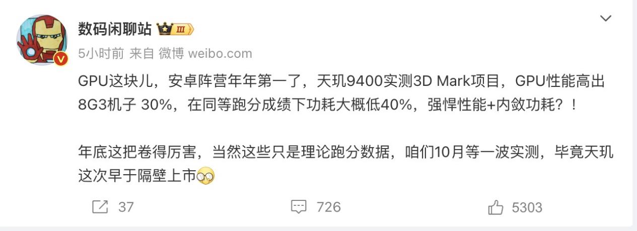 与此同时,另一位博主 @数码闲聊站 也在微博透露,天玑 9400 平台实测 3D Mark 项目,GPU 性能高出骁龙 8 Gen 3 平台达 30%,在同等跑分成绩下功耗大概低 40%。该博主直接感叹:“GPU 这块儿,安卓阵营年年第一了”、“强悍性能 + 内敛功耗?!”