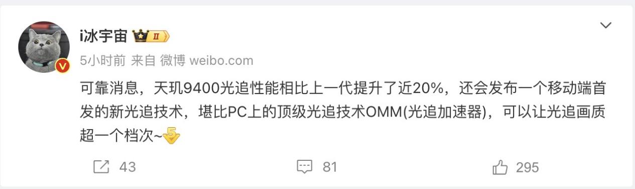 今天,消息源 @i冰宇宙 今天发布微博,透露联发科正酝酿天玑 9400 大杀器,光追画质再上新台阶。