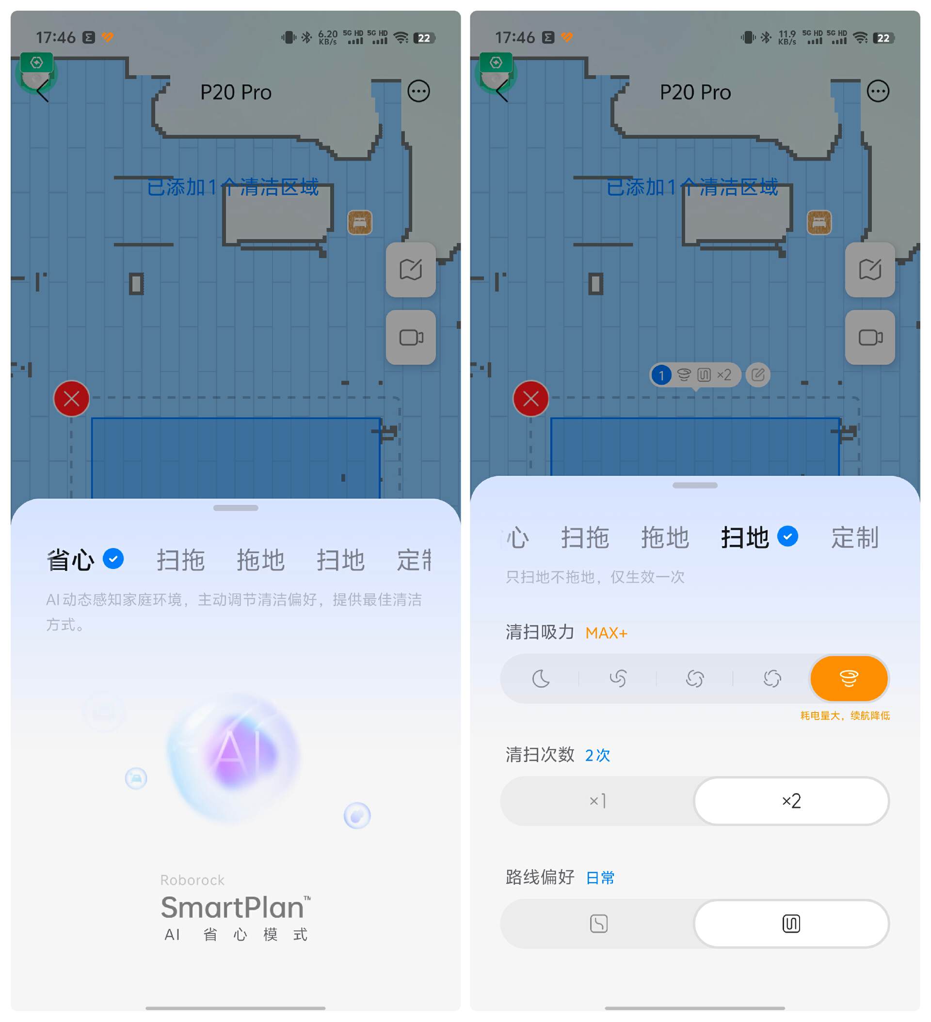 用户选择“AI 省心模式 2.0”,简单来讲,就是无需各种设置,“AI 省心模式 2.0”对不同房间智能生成清洁参数,主动设置最适合的清洁方式,启动清洁时智能规划清洁顺序、调节吸力、水量、路线偏好,实现一键自主清洁。