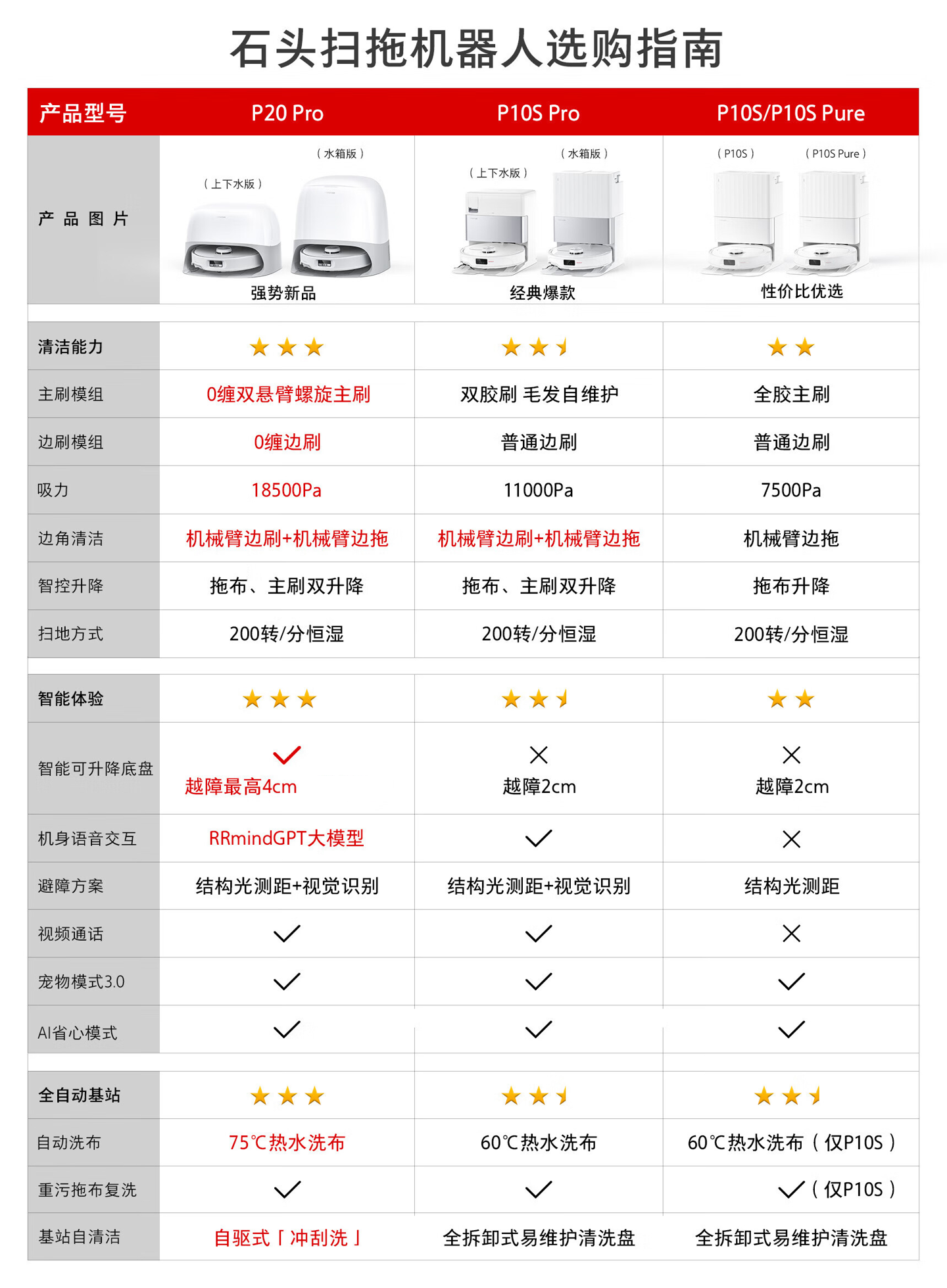 前一代 P10S Pro 的性价比已经足够高了,但是石头 P20 Pro 的横空出世,让笔者甚至有种“恍然隔世”的错觉 —— 全新的外观设计、首创 0 缠清扫系统、18500Pa 大吸力、智能底盘最高 4cm 越障能力、RRmindGPT 大模型、全能基站等,也不过是短短半年时间,升级程度如此之猛,依旧是 3999 元的起售价,石头的诚意依旧很足。
