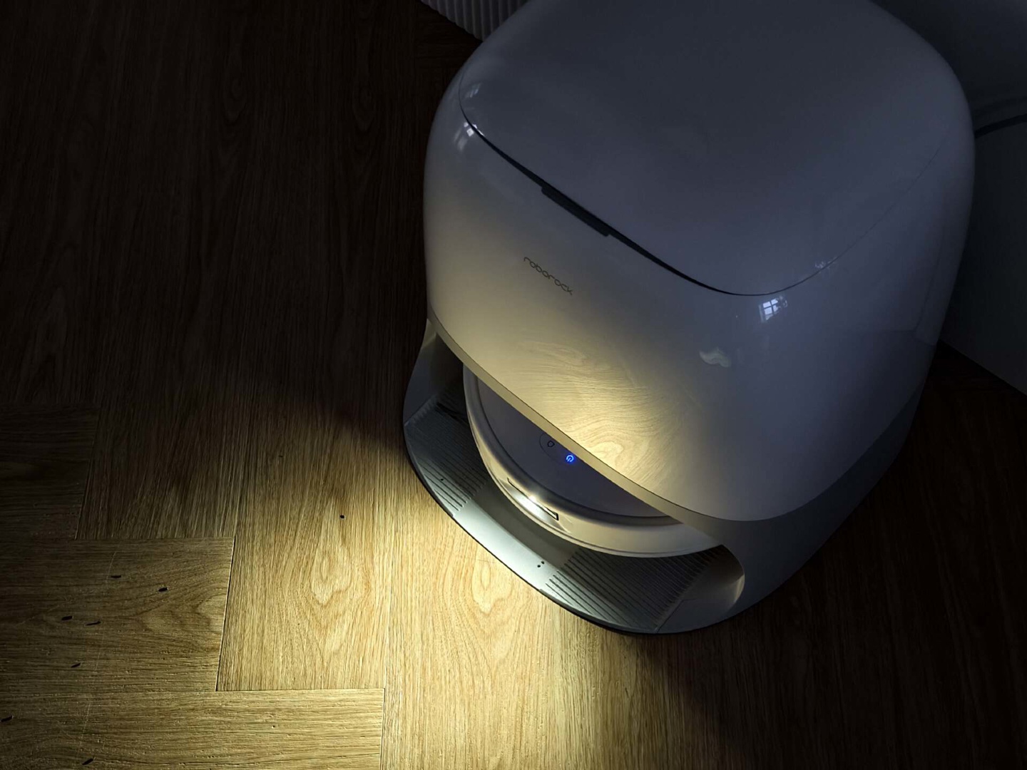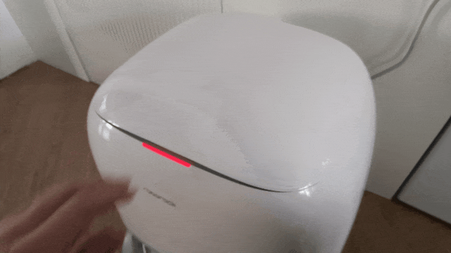 再来石头 P20 Pro 的基站变化。设计上,石头 P20 Pro 基站采用了掀盖式设计,污水箱和清水箱以及集尘袋均位于机身顶部,掀盖区域的缝隙内还有一枚长条状的 LED 灯,它能够通过红色、白色等不同的颜色变化来直观显示设备的当前状态。