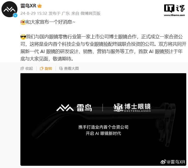 IT之家 8 月 29 日消息,AR 眼镜公司雷鸟创新官方微博“雷鸟 XR”今日宣布,该公司与国内眼镜零售行业第一家上市公司 —— 博士眼镜合作,正式成立一家合资公司,这将是业内首个科技企业与专业眼镜验配终端联合投资的公司。