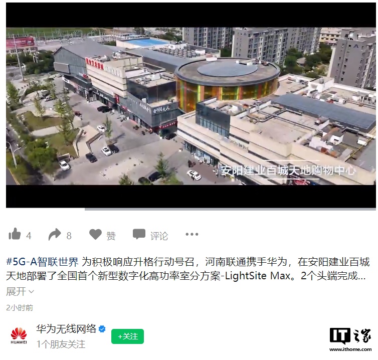IT之家 8 月 29 日消息,据华为官方今日消息,河南联通携手华为,在安阳市建业百城天地成功部署了全国首个新型数字化高功率室分方案 —— LightSite Max