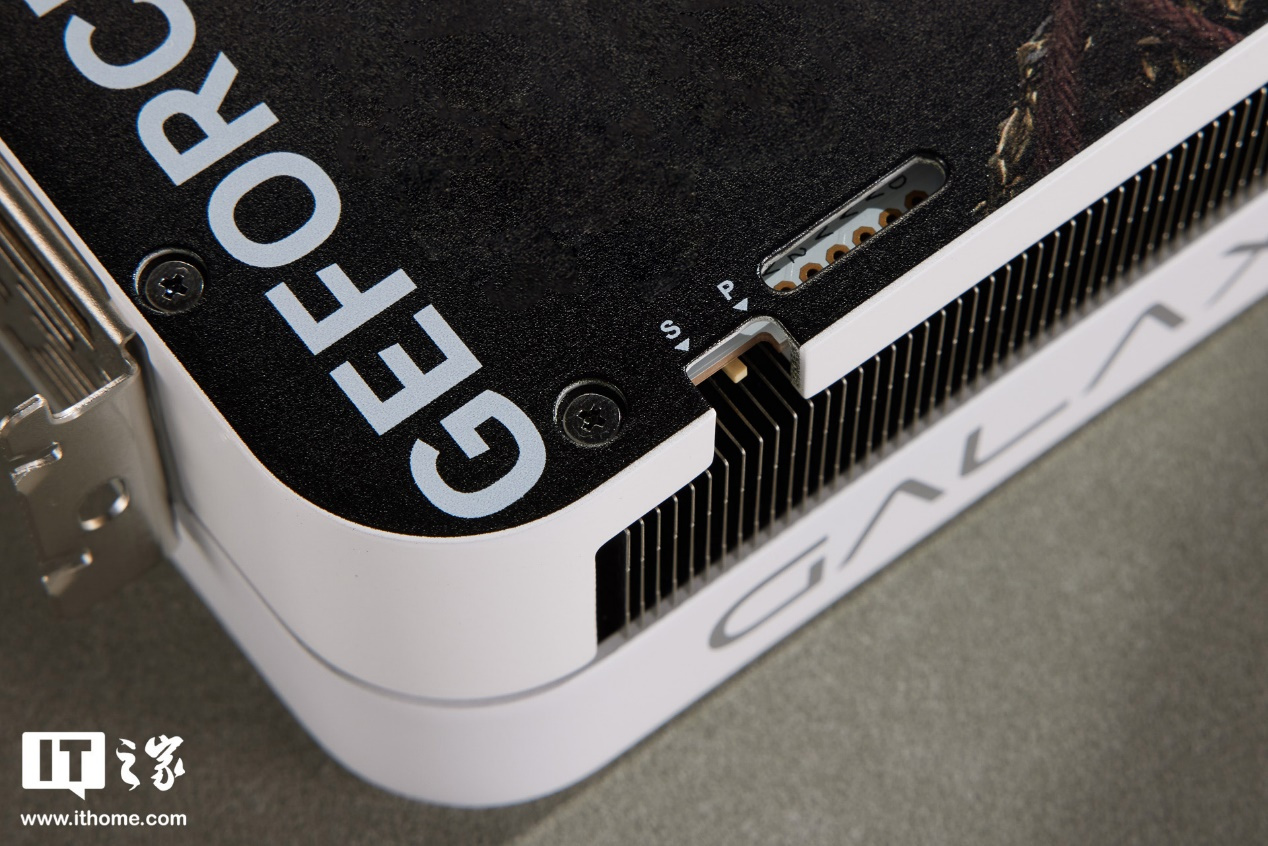 而在显卡背板的左下角,影驰还设计了一个双 BIOS 开关,用户可以在 S 默认档和 P 性能档之间切换,自由选择性能水平。当处于 S 默认档时,显卡 TDP 为固定的 295W,而切换到 P 性能档后显卡功耗可进一步解锁至最高 366W,显卡加速频率也由 S 档的 2610MHz 提升到 2670MHz。