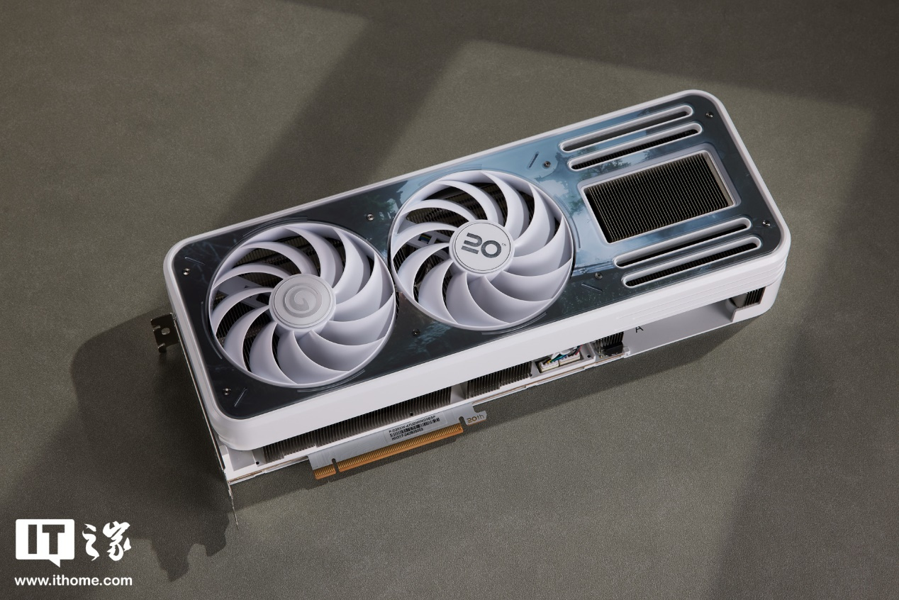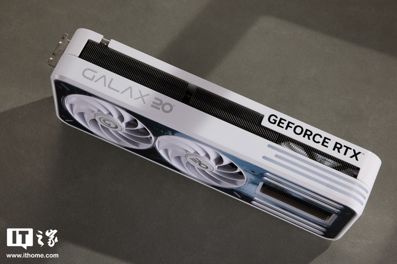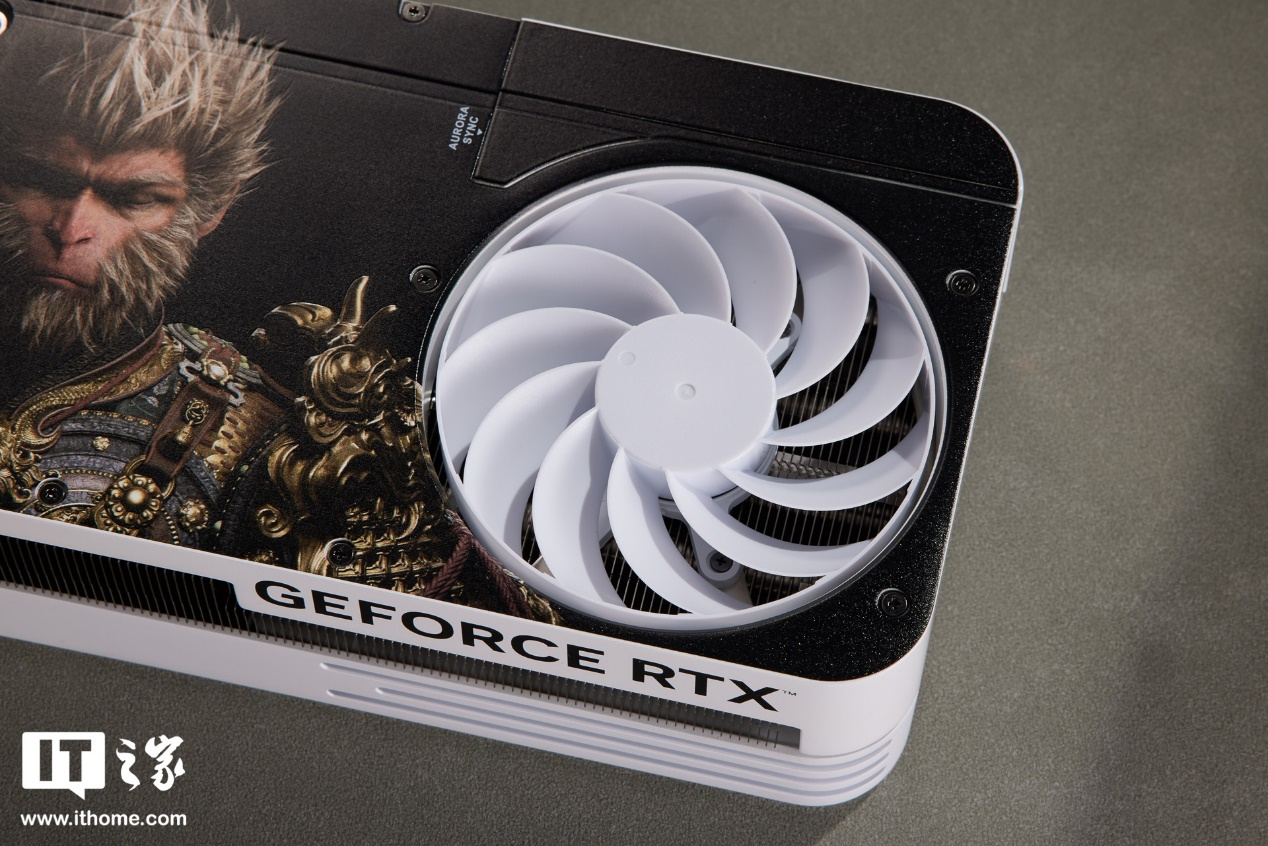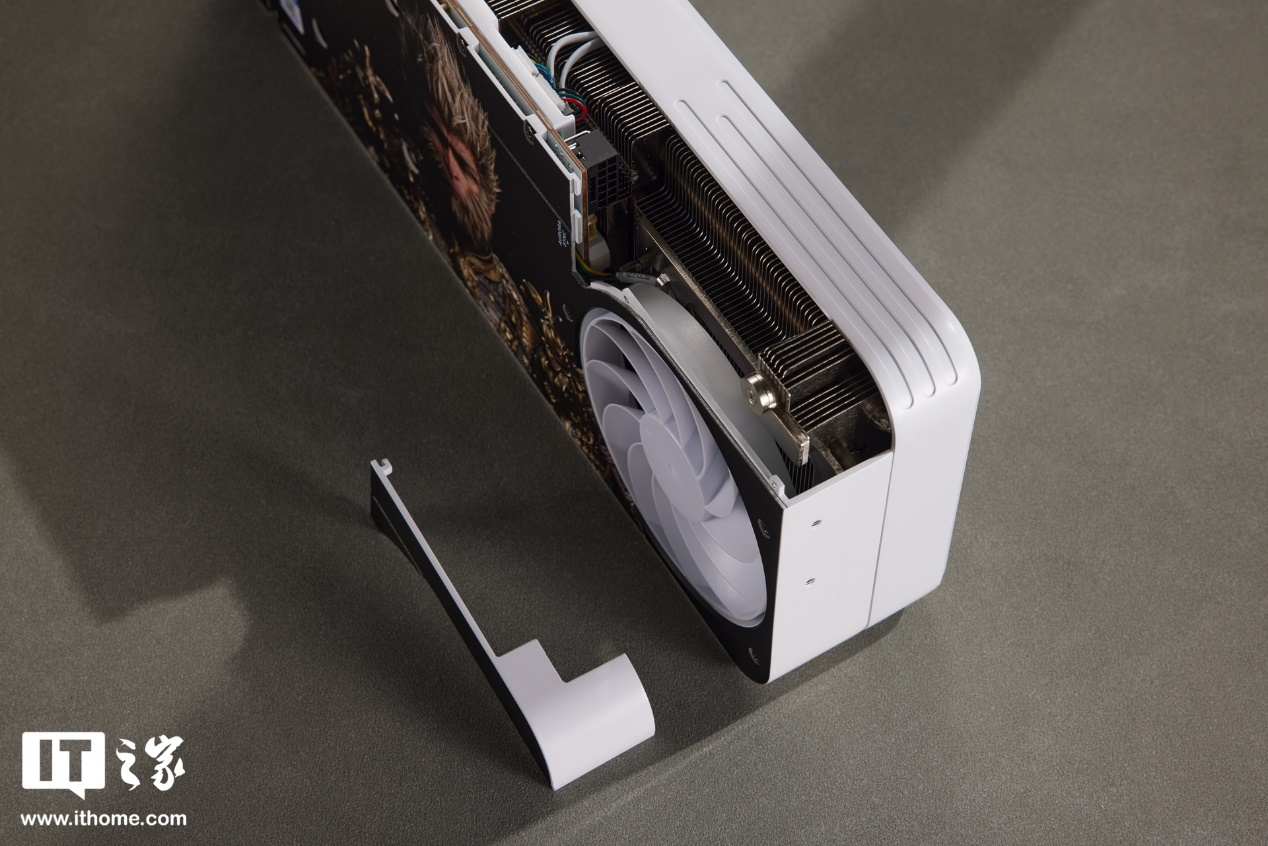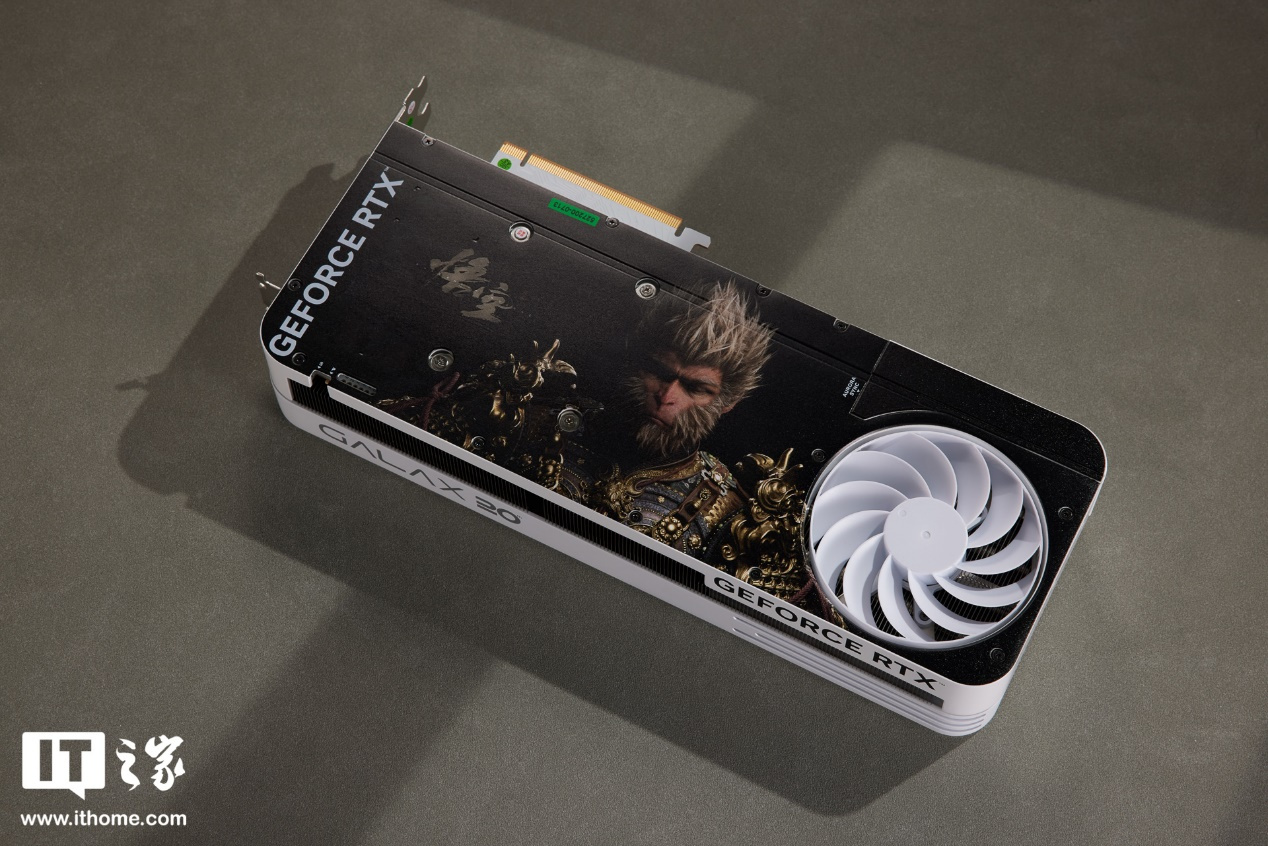 显卡正面为双 100mm 正叶风扇设计,扇叶纯白,轴柱上则印有影驰和 20 周年的 Logo。装甲右侧保留了一组规整的散热开孔,能够清楚看到内部的金属散热格栅。而装甲的定制涂装,选择的是黑神话悟空游戏场景的原画,非常有意境,表明的磨砂质感光滑细腻,使整体呈现出黑白撞色风格。
