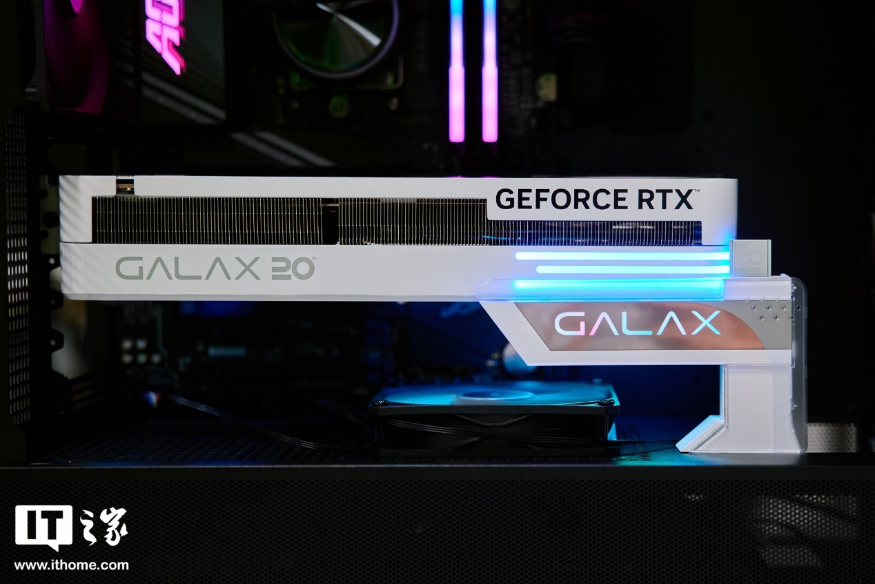 上机之后可以看到,在横装显卡时由于正面没有了电源线遮挡,RGB 效果更加自然,影驰甚至为其配备了一个自带 RGB 效果的显卡支架。