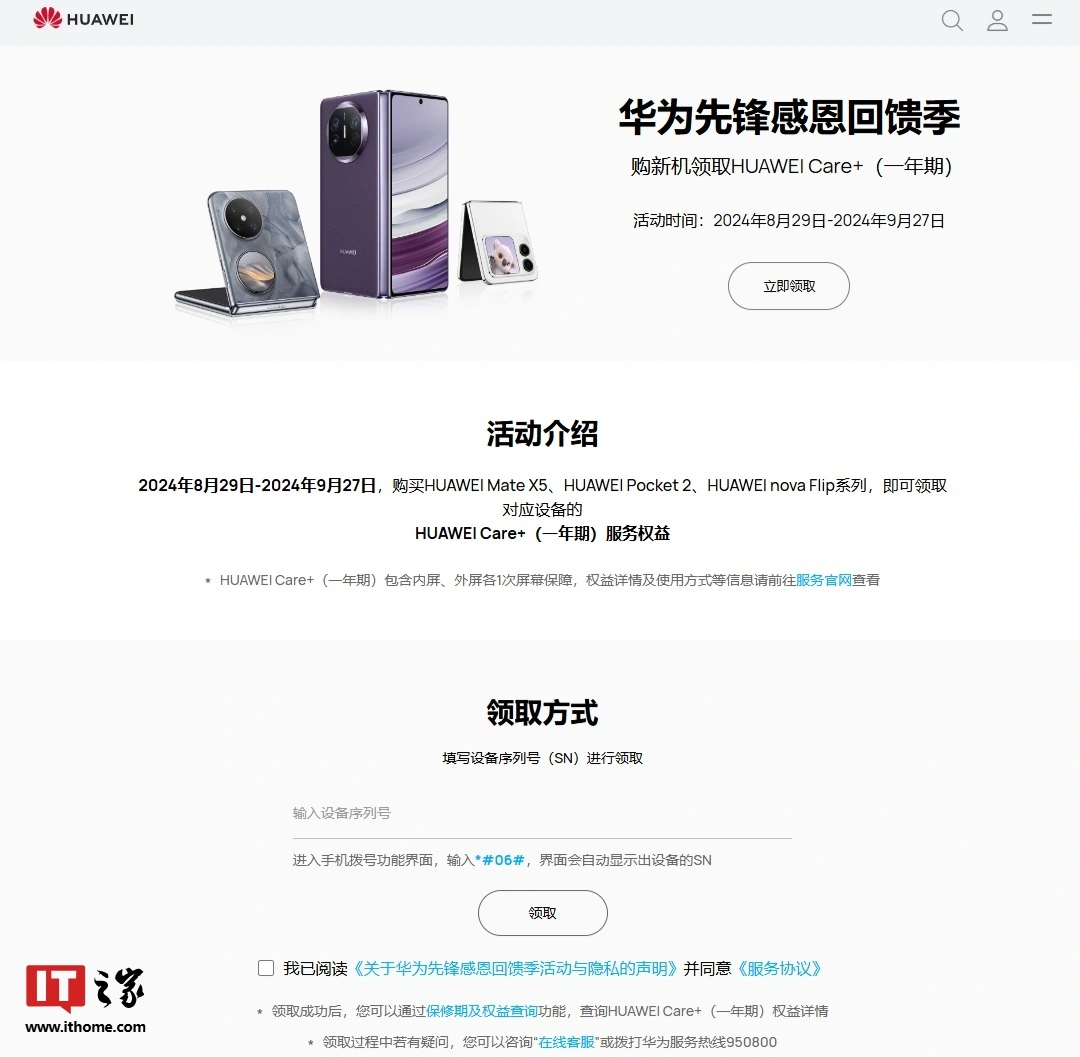 目前,华为官网已开放“华为先锋感恩回馈季”活动,在活动期间购买 HUAWEI Mate X5、Pocket 2、nova Flip 系列手机,可领取对应设备 HUAWEI Care+(一年期)服务权益