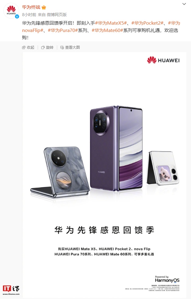 IT之家 8 月 29 日消息,华为官宣开启“先锋感恩回馈季”活动,购买 Mate X5、Pocket 2、nova Flip、Pura 70、Mate 60 系列手机可享购机礼遇。