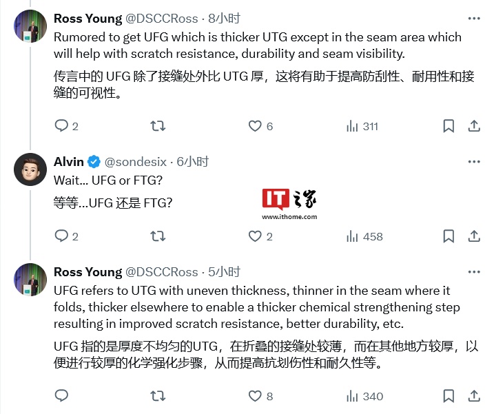 IT之家注:UFG 指的是厚度不均匀的 UTG,在折叠的接缝处较薄,而在其他地方较厚,通过较厚的化学强化步骤,从而提高抗划伤性和耐久性等,且能缓解折痕问题。