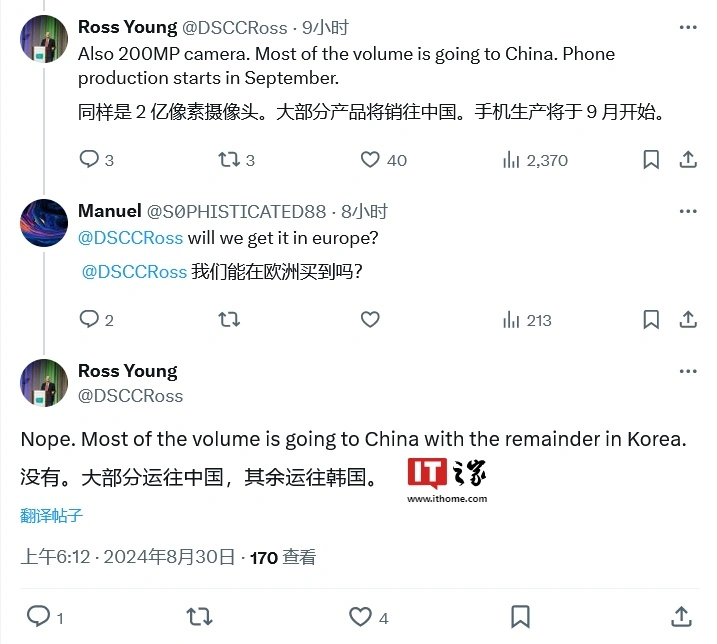 IT之家 8 月 30 日消息,屏幕供应链咨询公司 DSCC 首席执行官罗斯・杨(Ross Young)今天(8 月 30 日)在 X 平台发布推文,认为 Galaxy Z Fold 特别版(国内应叫 W25)手机将于 9 月开始组装生产,大部分销往中国市场。