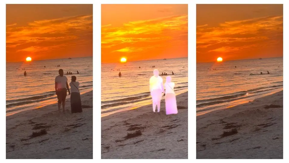 一旦点击“清理”,iOS 18.1会识别出可能不需要的元素,并用苹果智能的新颜色将其勾勒出来。比如,我在日落照片中海滩上的人。然后,只需轻点你想删除的元素,“清理”就会用AI自动将其移除并填补空白。这种方法类似于其他照片编辑应用中的魔术橡皮擦工具。