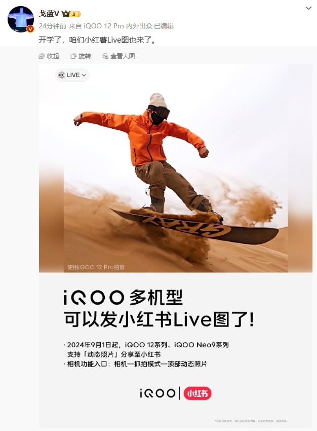 文章来源于互联网:IT之家-iQOO 12 / Neo9 系列手机已支持发布小红书 Live 图