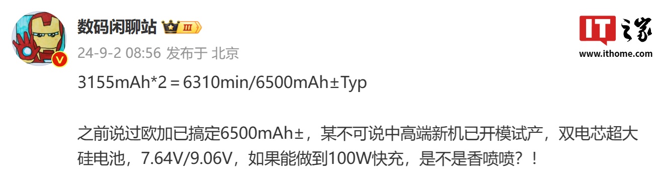IT之家 9 月 2 日消息,博主 @数码闲聊站 今日发文透露“3155mAh*2=6310min / 6500mAh±Typ”电池方案,并称“欧加已搞定 6500mAh±,某不可说中高端新机已开模试产,双电芯超大硅电池,7.64V / 9.06V”。