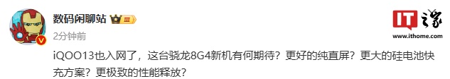 此前还有消息称,某厂“骁龙 8 Gen 4 新旗舰”手机采用京东方 2K 显示屏,全线换屏幕形态模具,工程机 50Mp 三摄 DECO 变化不大,电池容量设定 6 开头,没有无线充。结合两条爆料来看,预计为同一款手机 —— iQOO 13。