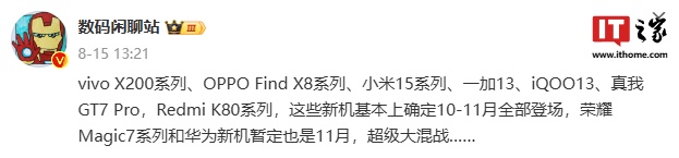 IT之家注意到,此前的爆料显示,vivo X200 系列、OPPO Find X8 系列、小米 15 系列、一加 13、iQOO13、真我 GT7 Pro,Redmi K80 系列等新机“基本上确定 10-11 月全部登场”,荣耀 Magic7 系列和华为新机暂定也是 11 月。