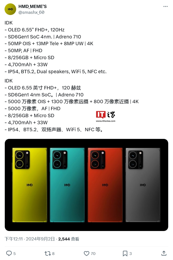 IT之家 9 月 3 日消息,消息源 @smashx_60 昨日(9 月 2 日)在 X 平台发布推文,分享了 HMD Hyper 智能手机的最新渲染图,展示了 4 种新的颜色和部分规格信息。