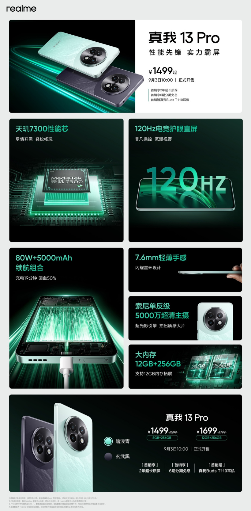 IT之家 9 月 3 日消息,realme 真我 13 Pro 手机今日正式发布,该手机首发搭载天玑 7300 处理器,配备 120Hz 高刷直屏(1200Hz 瞬时采样率、AI 全链路护眼),首发价 1499 元起。