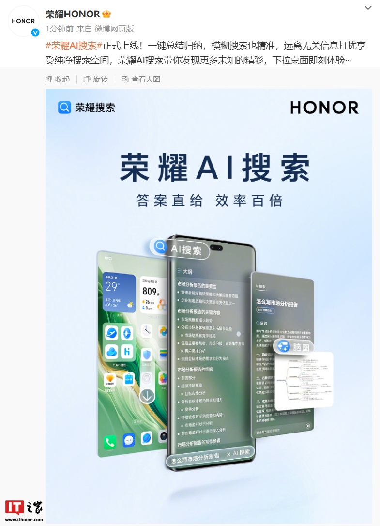 文章来源于互联网:IT之家-荣耀手机 AI 搜索正式上线:支持一键总结归纳、模糊搜索精准结果等功能