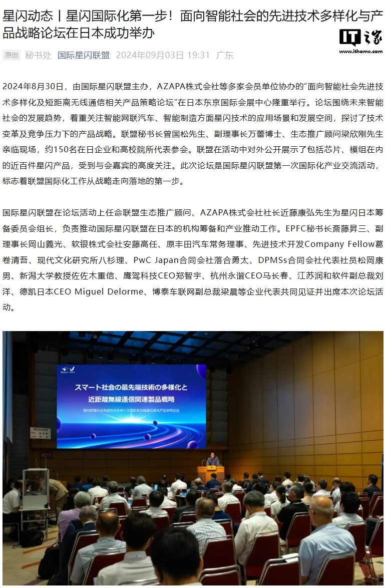 IT之家 9 月 3 日消息,2024 年 8 月 30 日,由国际星闪联盟主办,AZAPA 株式会社等多家会员单位协办的“面向智能社会先进技术多样化及短距离无线通信相关产品策略论坛”在日本东京国际会展中心举行。
