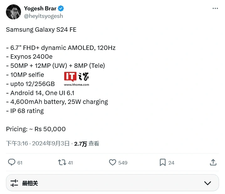 IT之家 9 月 4 日消息,消息源 Yogesh Brar 昨日在 X 平台发布推文,曝料三星 Galaxy S24 FE 手机规格信息,表示该机最高可选配 12GB 内存和 256GB 存储。