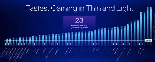 在图形能力上,英特尔强调自家芯片在1080p中等设置条件下,帧数比起高通旗舰AI PC芯片高出68%,特别是数十款游戏根本无法在高通芯片下运行。当然,使用万元轻薄笔记本打游戏是否是“伪需求”,就要看各位消费者的态度了。
