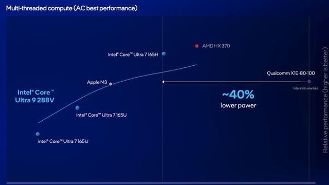 作为这一批芯片中的旗舰单品,Ultra 9 288V在多线程性能/功耗曲线中能够与苹果M3打个平手,而在相同性能表现下,比高通X Elite的旗舰芯片X1E-80-100功耗低40%。