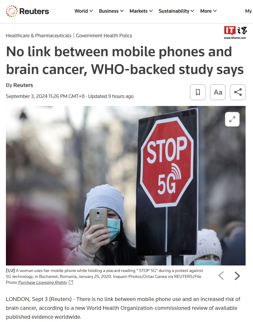 IT之家 9 月 4 日消息,当地时间 9 月 3 日,据路透社报道,世界卫生组织委托对全球范围内已发表的现有证据进行的最新调查发现,使用手机与罹患脑癌风险增加之间并无关联。